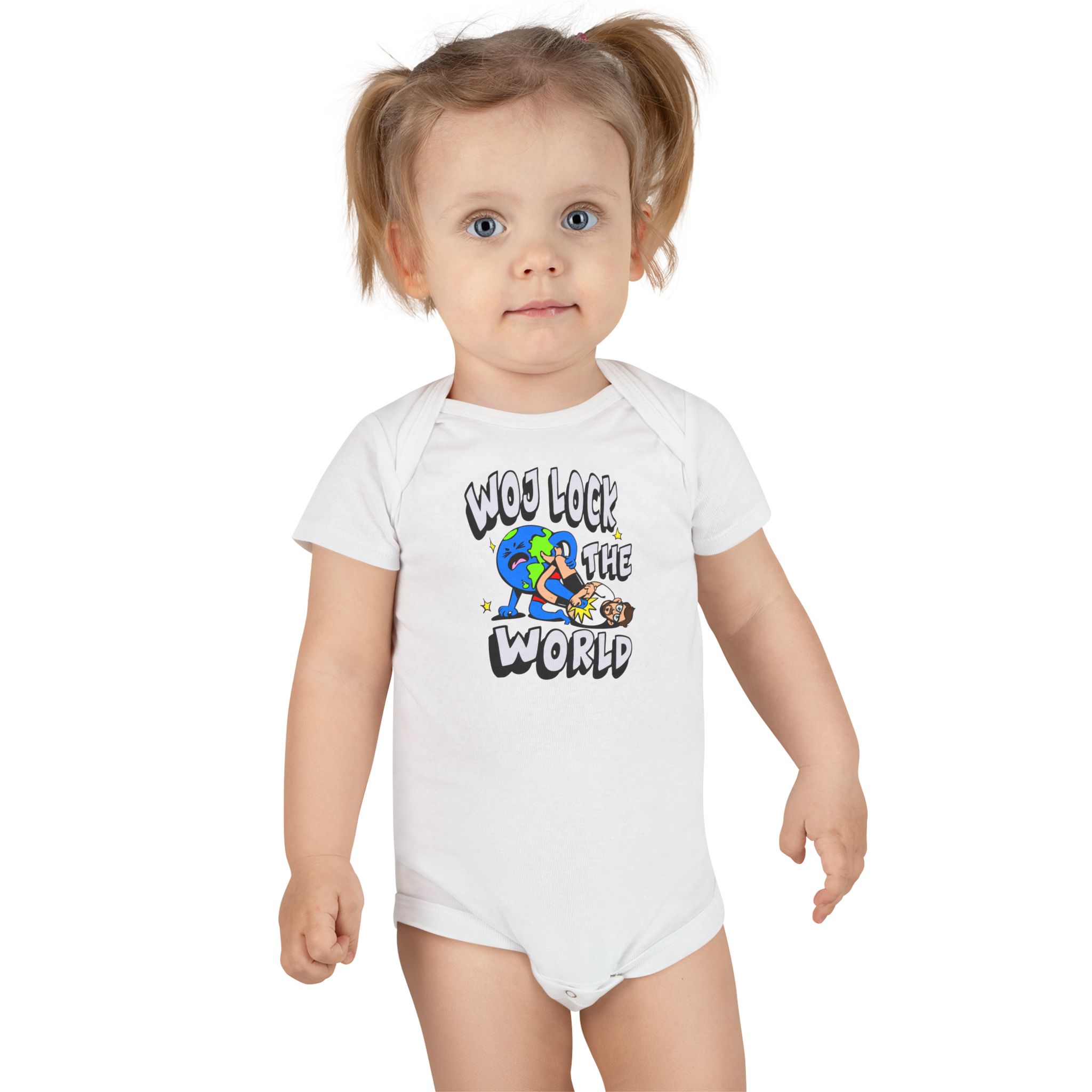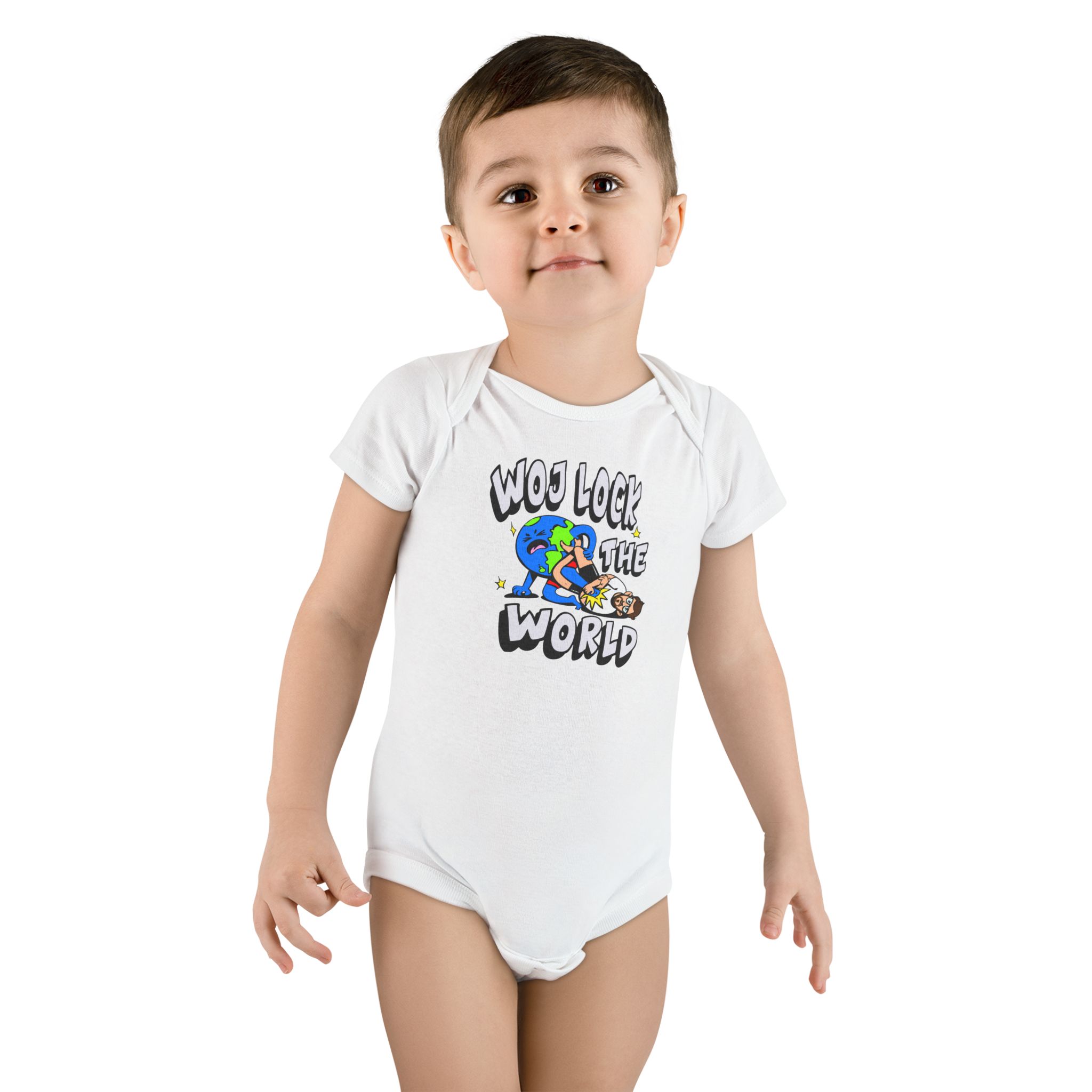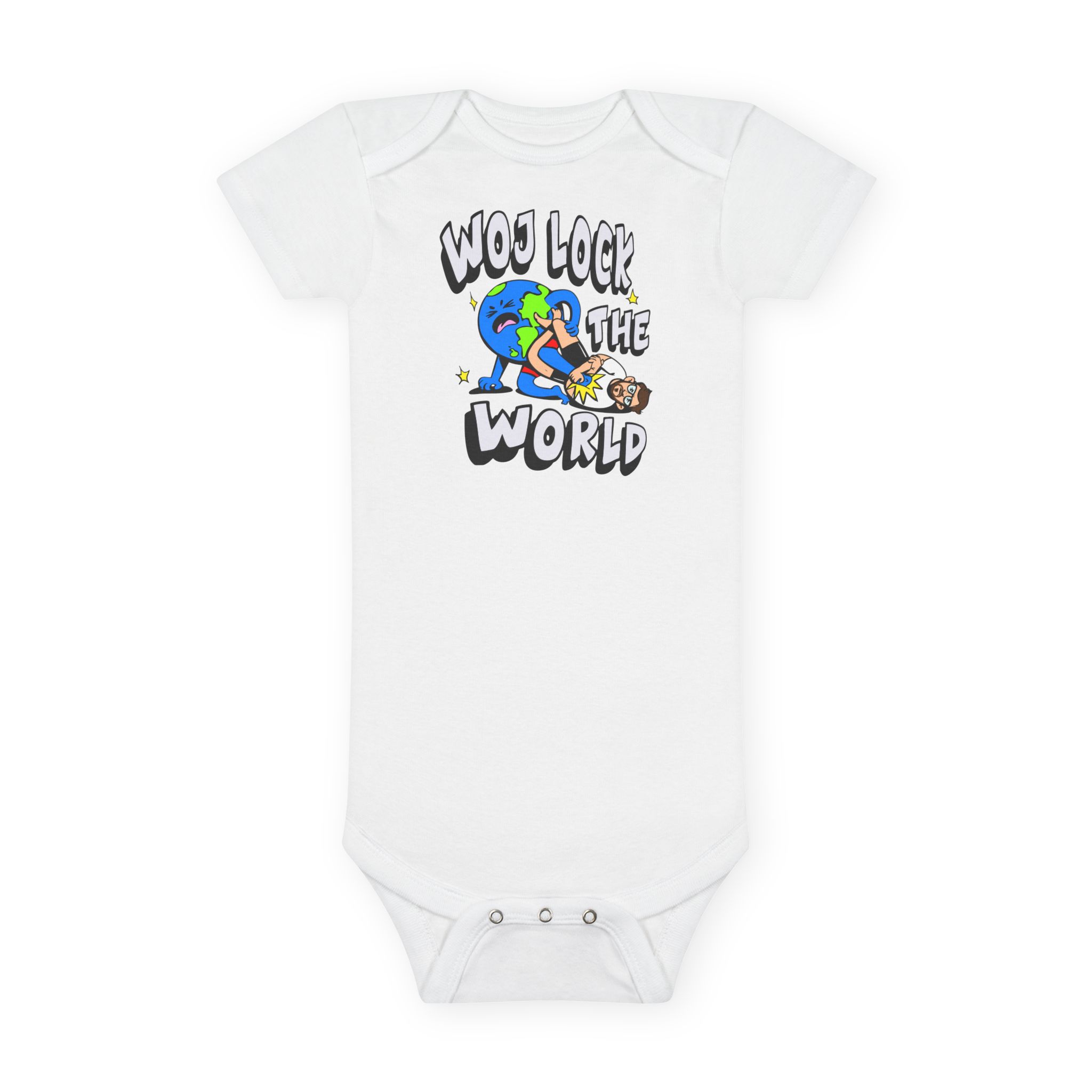 The custom short-sleeve baby Onesie® is built from 100% cotton rib. This makes for a comfortable, secure fit for newborns and toddlers. The neckline is constructed with a lap shoulder. This inclusion assists with manipulating the fabric around the baby’s head. The bottom has a snap closure – designed with easy changing in mind. Both legs have ribbed openings for stability.